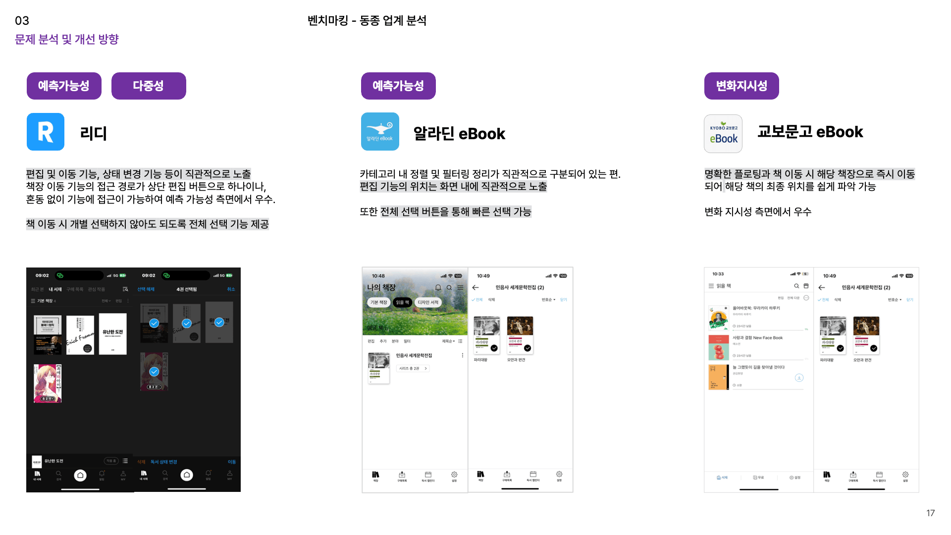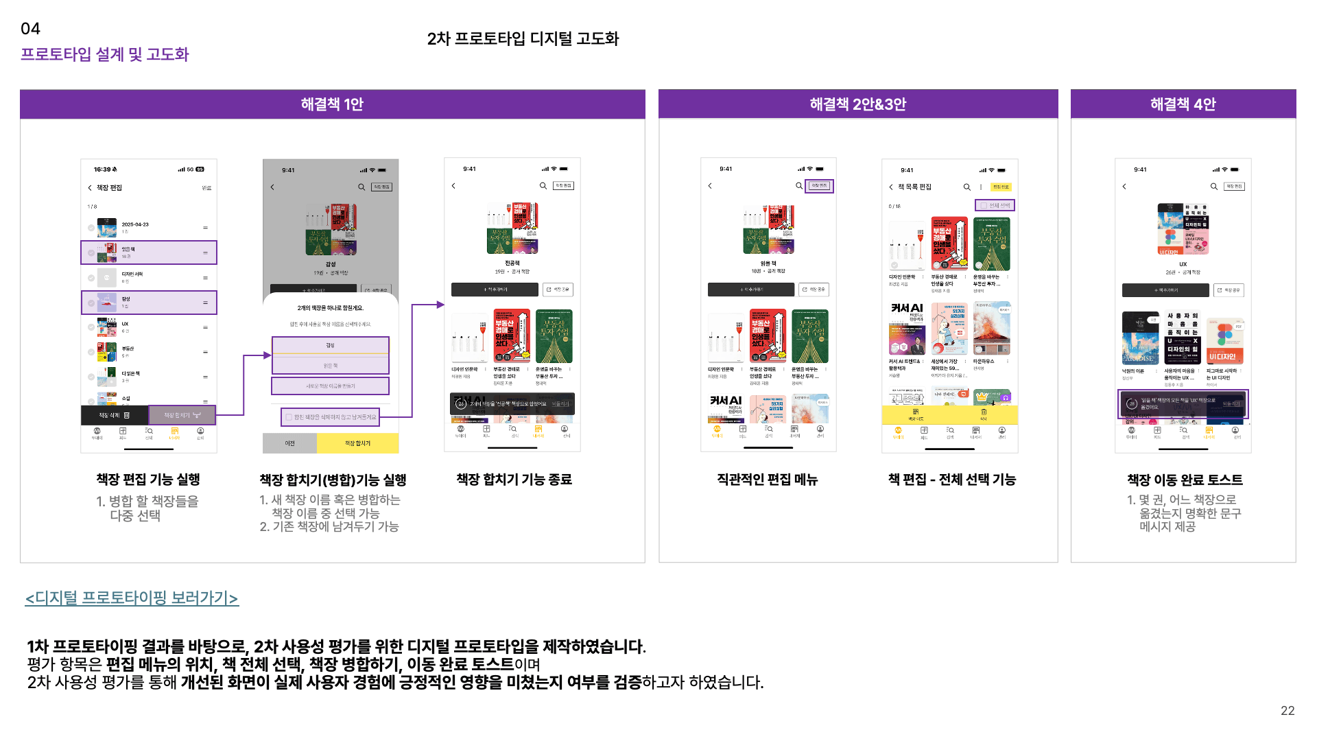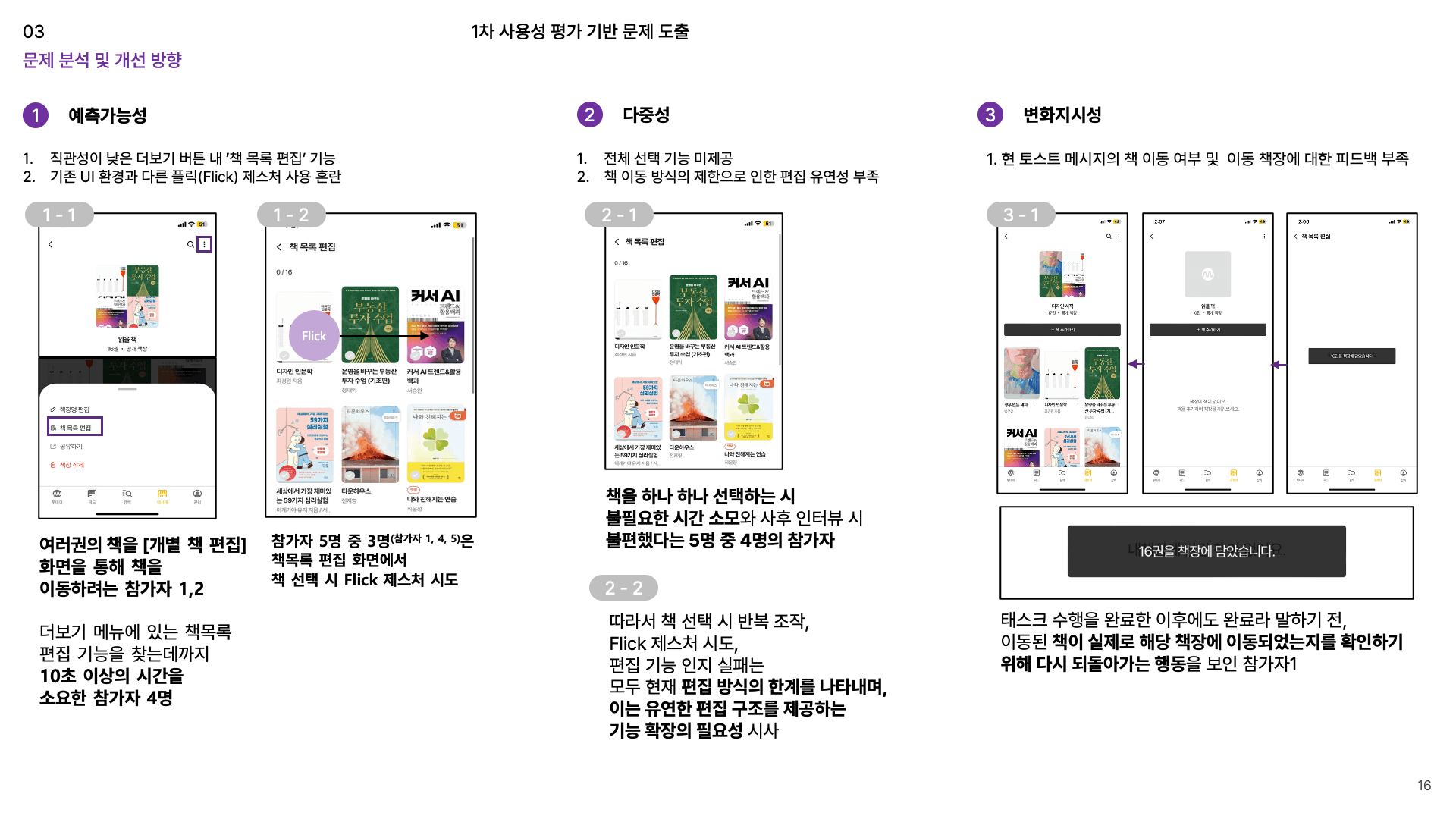 - 전체 선택, 책장 병합, 이동 Action Sheet 같은 핵심 기능의 UX 흐름을 설계했어요.
