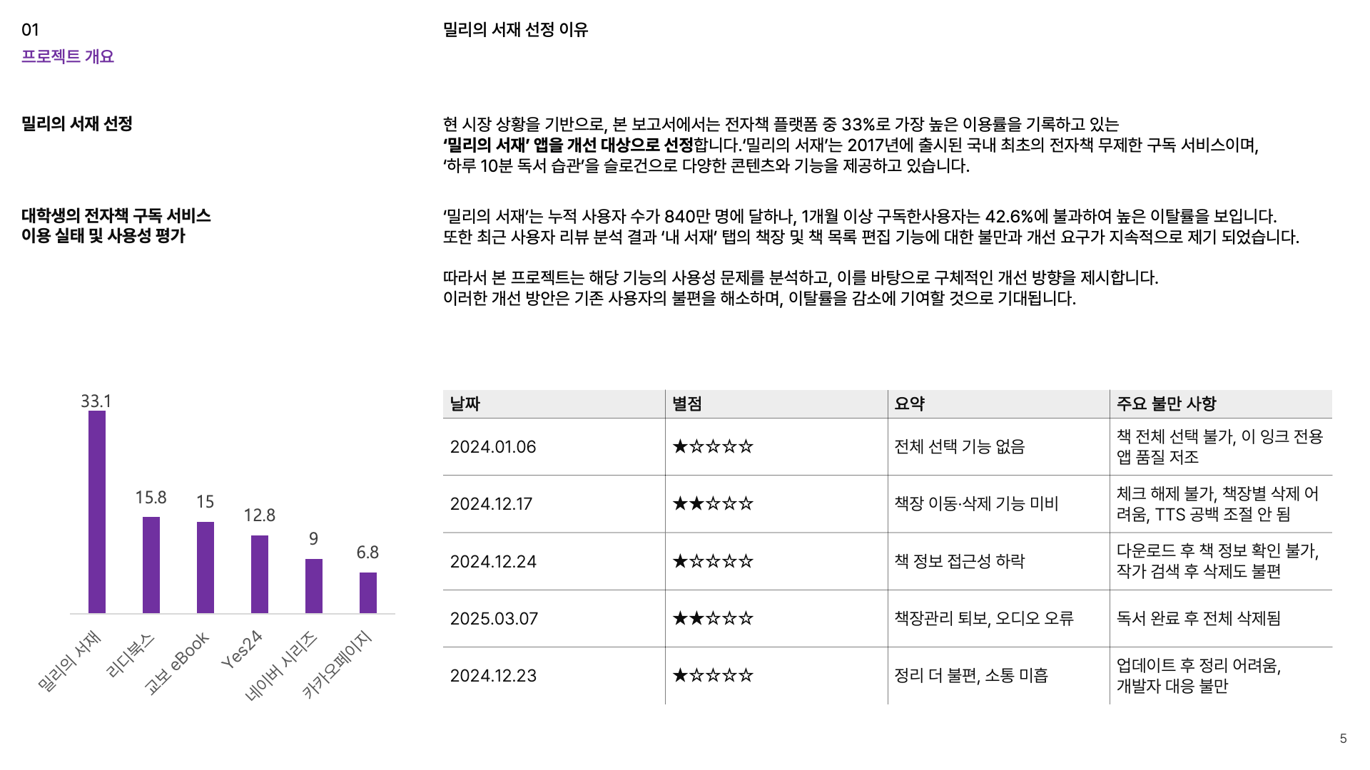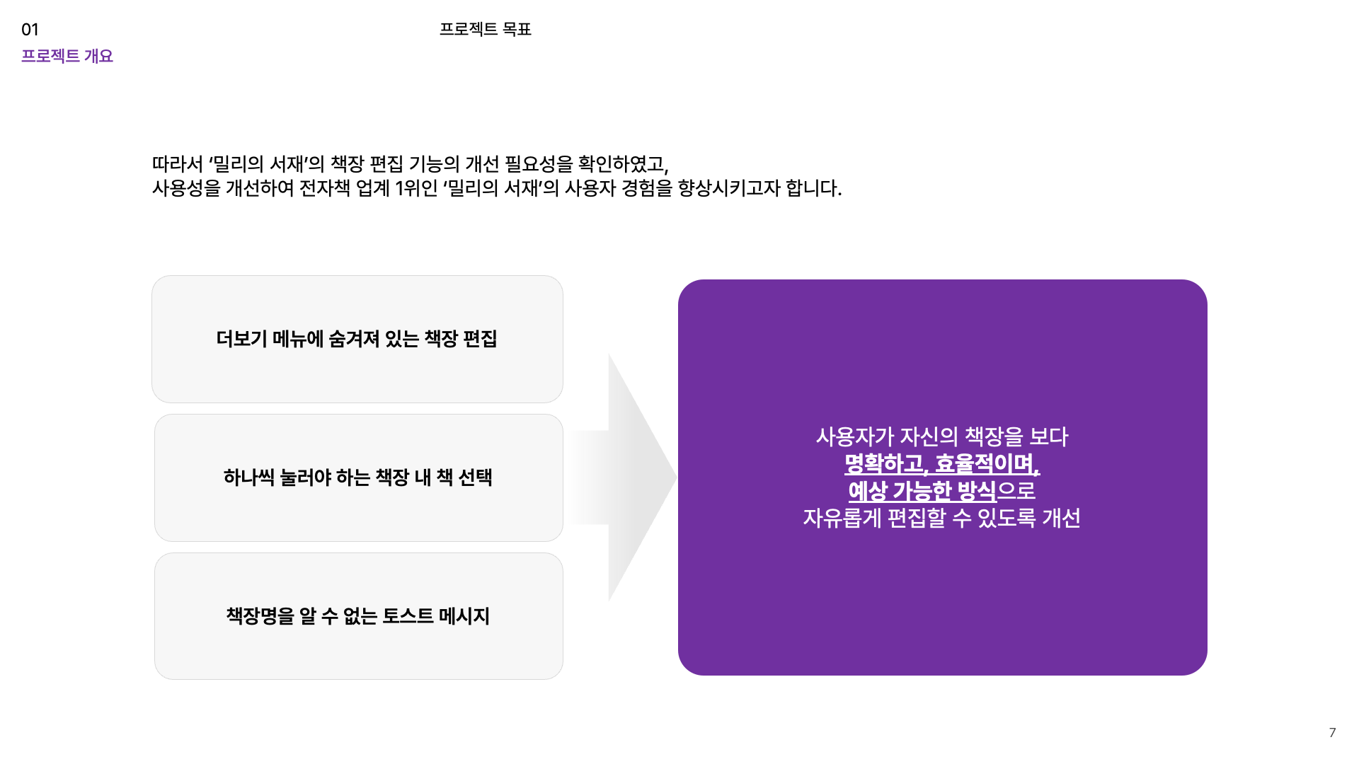 - 밀리의 서재 앱의 책장 편집 기능은 사용 빈도가 높았지만, 편집 기능 진입 경로, 책 선택 방식, 이동 후 피드백 구조에서 반복적인 사용성 문제가 있었어요.